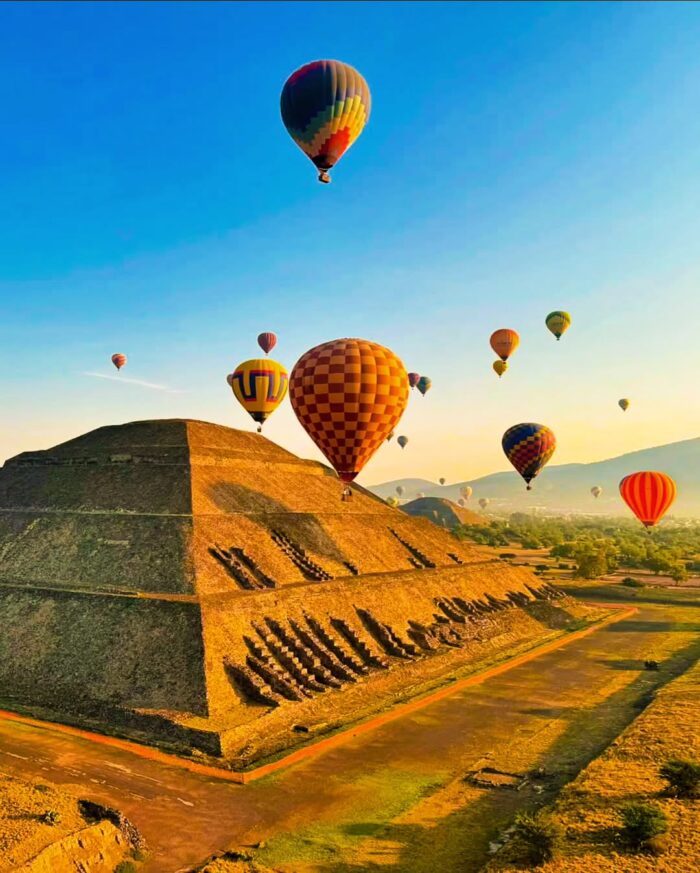 Disfrute la maravillosa estética de las pirámides del Sol y de la Luna vistas desde un diferente ángulo. La actividad comienza al amanecer (después de las presentaciones y algunas indicaciones dadas), todos participaremos en llenar el globo con aire caliente, una experiencia mágica. Volaremos durante una hora aproximadamente; donde veremos las monumentales pirámides del Sol y la de la Luna, el Templo de Quetzalpapalotl y la Calzada de los Muertos. Incluye desayuno tipo buffet.
